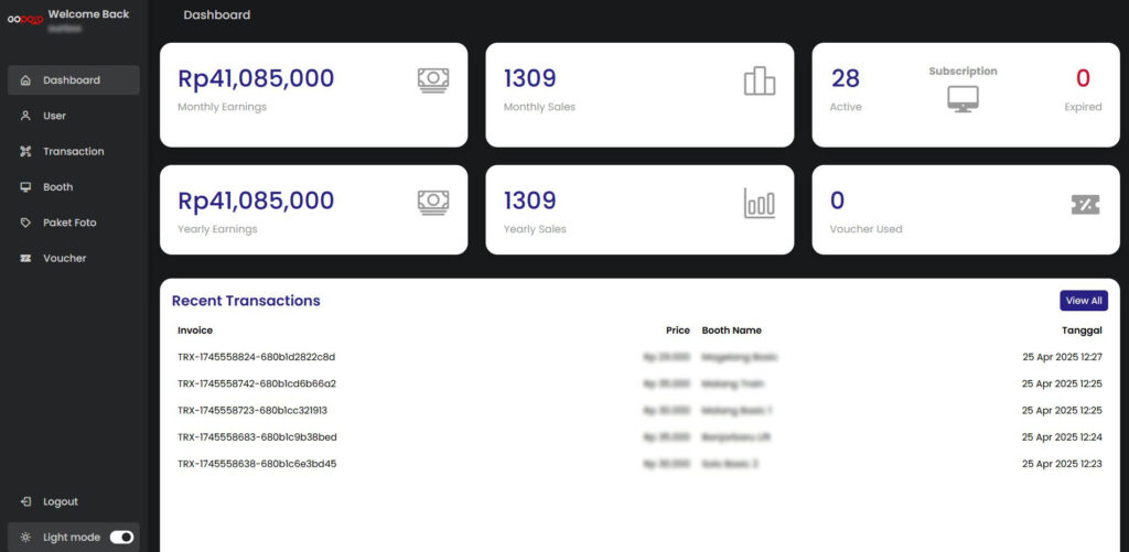 Dashboard ini berisi informasi dan statistik penggunaan booth anda, perhitungan transaksi dari QRIS dan voucher, dan beragam fitur menarik lainnya