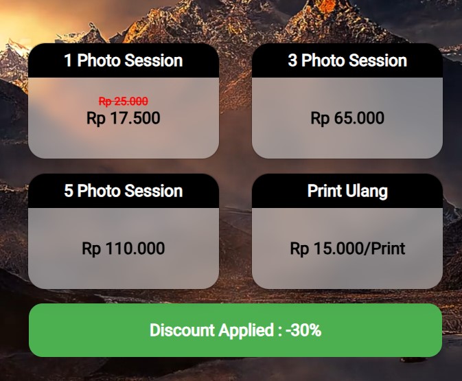 Sistem kami memungkinkan pengunjung memilih paket lebih dari 1 sesi foto untuk meningkatkan penjualan photobox anda. Pilihan paket sesi foto dapat anda atur sendiri, hingga maksimal 3 paket.