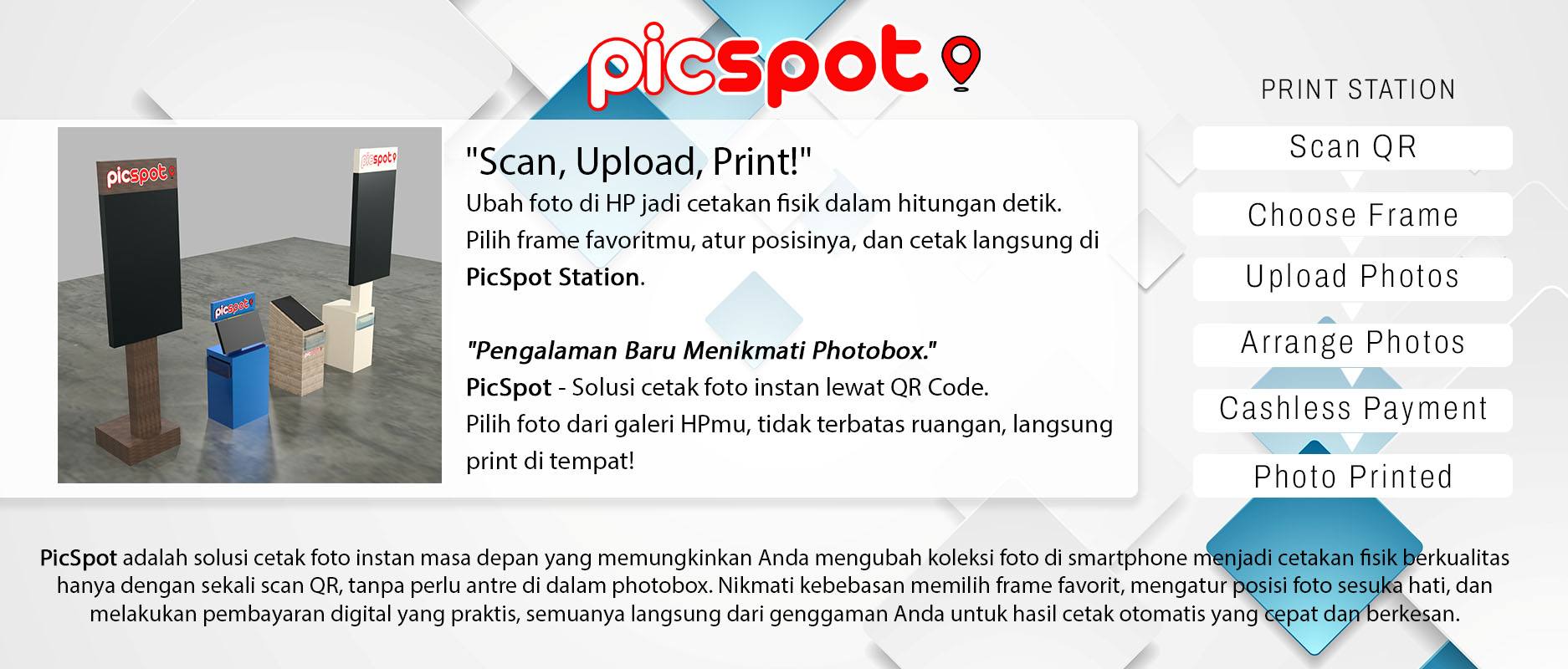PicSpot dirancang khusus buat kamu generasi yang anti ribet. Kami sadar, kamera terbaik adalah kamera yang sudah ada di saku celanamu: smartphone. Jadi, PicSpot menghilangkan semua kerumitan perangkat keras dan fokus pada experience mencetak kenangan. Begini alurnya: